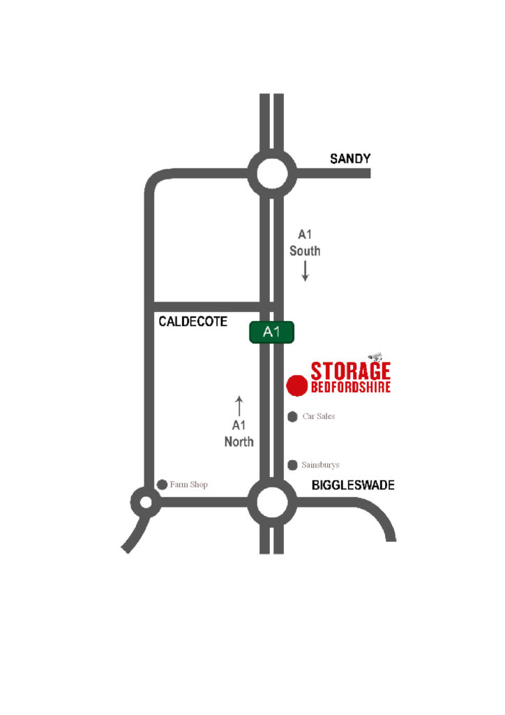 We offer easy access and are situated on the Southbound Carriageway of the A1 or Great North Road. Storage Bedfordshire is just north of the Biggleswade North Roundabout past Sainsbury’s but on the south carriageway so if coming from the south you will have to go past us and turn around to come back down the south side of the A1. Take a look at the map below and all will be made clear hopefully. If not just give us a call on 01767 312182 and ask.